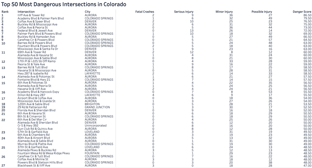 - Aurora has the highest number of dangerous intersections: Nearly half of Colorado’s 50 most dangerous intersections are located in Aurora. These intersections alone accounted for 1357 injuries, more than Denver and Colorado Springs combined within the Top 50.