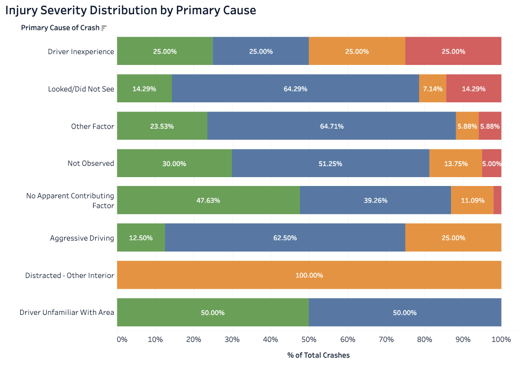 - Driver Inexperience: This category has the highest correlation with fatality (25% of recorded crashes were fatal). New drivers may lack the judgment to execute complex left turns against traffic or judge gaps in high speeds.