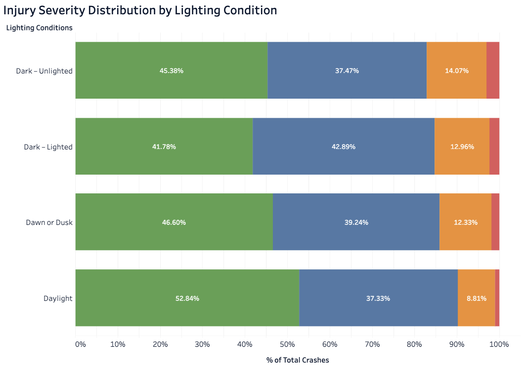 - Nighttime crashes are more severe: Crashes that occur at night are more likely to be fatal or result in severe injuries than crashes during the day. Even with street lighting, reduced visibility at night increases the risk of severe outcomes for everyone involved.