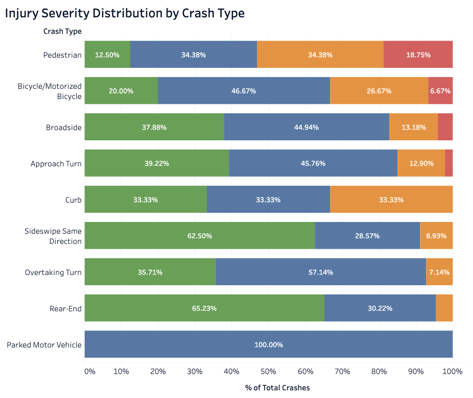 - Bicycle and motorized bicycle crashes also have a high severity rate, with a meaningful portion resulting in serious or fatal injuries, especially when interacting with turning vehicles.